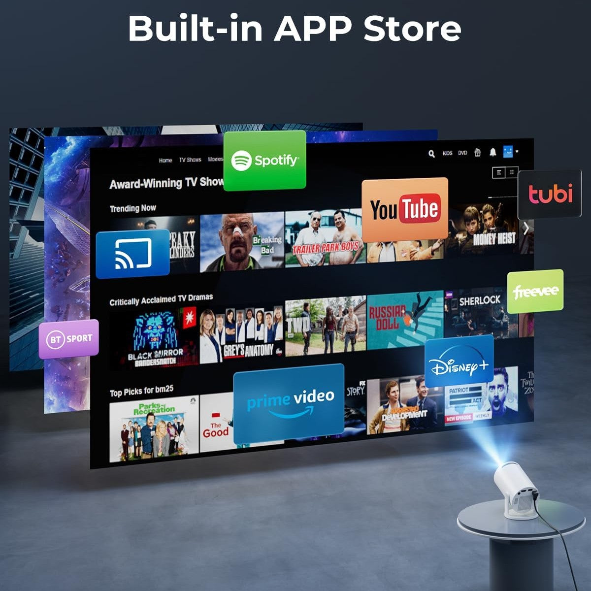 The KroniCast Projector supports 4K content, offers a native 720p resolution, automatic focus, and built-in speakers. Stream Netflix, Disney+, Amazon Prime, YouTube, and more with clear visuals and rich, cinematic sound.
