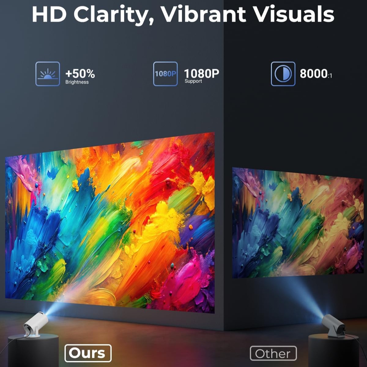 The projector features a native 720p resolution and supports 4K input from external devices for enhanced visual clarity.